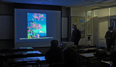 スクリーンに投影された作品は、マクロレンズによるバラの花、兵庫県出石市の観光施設、今切れの砂丘に見え