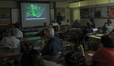 投影された写真は、台湾にある17世紀の要塞や大砲、台北近くの集合住宅の様子、二俣城跡のシダや森町のヒガンバ